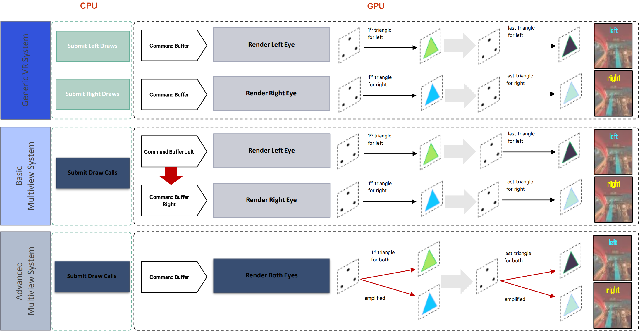 VR 등의 렌더링을 최적화하는 데 사용되는 멀티뷰 비교 차트. 위: 멀티뷰 모드가 없는 렌더링, 두 눈이 각각 드로잉 명령을 제출하는 경우, 가운데: 제출 명령을 다중화하고 GPU 레이어에 명령 목록의 추가 복사본을 복제하는 기본 멀티뷰 모드, 아래: DC, 명령 목록 및 지오메트리 정보를 다중화하는 고급 멀티뷰 모드. bKeepDepthContent는 깊이 콘텐츠를 보존할지 여부를 표시하여 해당 코드를 결정합니다: