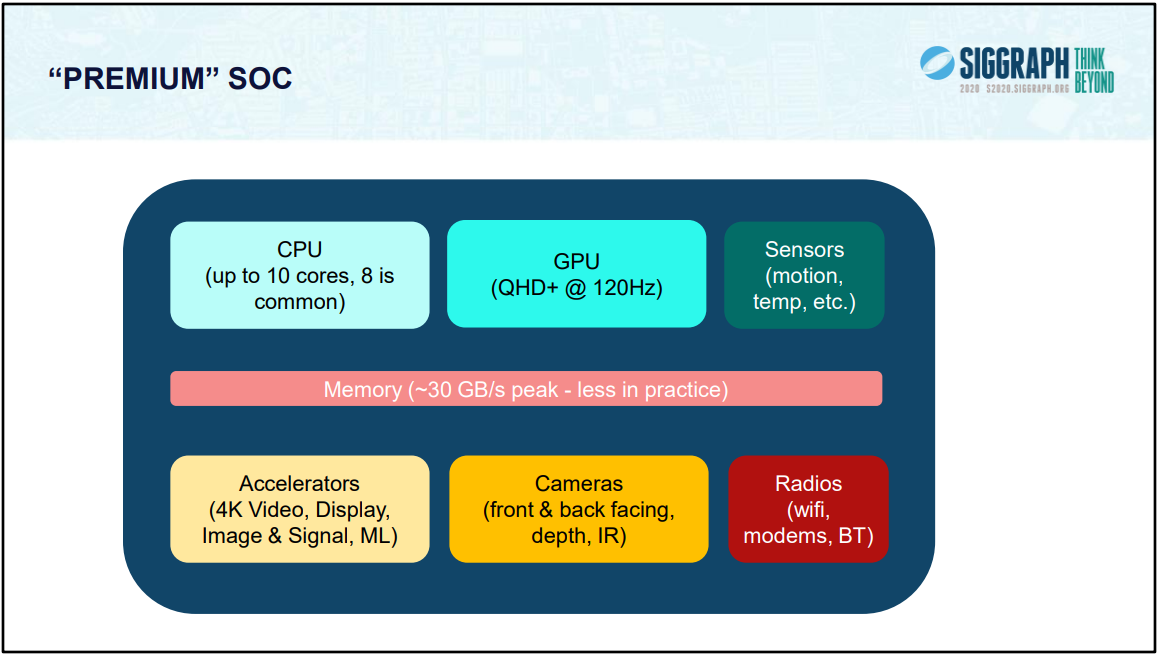 2018년 메인스트림 PC 디바이스(NV GV100-400-A1 Titan V)와 메인스트림 모바일 디바이스(삼성 엑시노스 9 8895)의 성능 비교 차트. 모바일 디바이스의 하드웨어 성능은 PC 디바이스의 10분의 1에 불과하지만 해상도는 PC의 절반에 가깝다는 점에서 모바일 디바이스의 도전과 딜레마가 더욱 부각됩니다. 2020년까지 주류 모바일 디바이스의 성능은 다음과 같습니다: