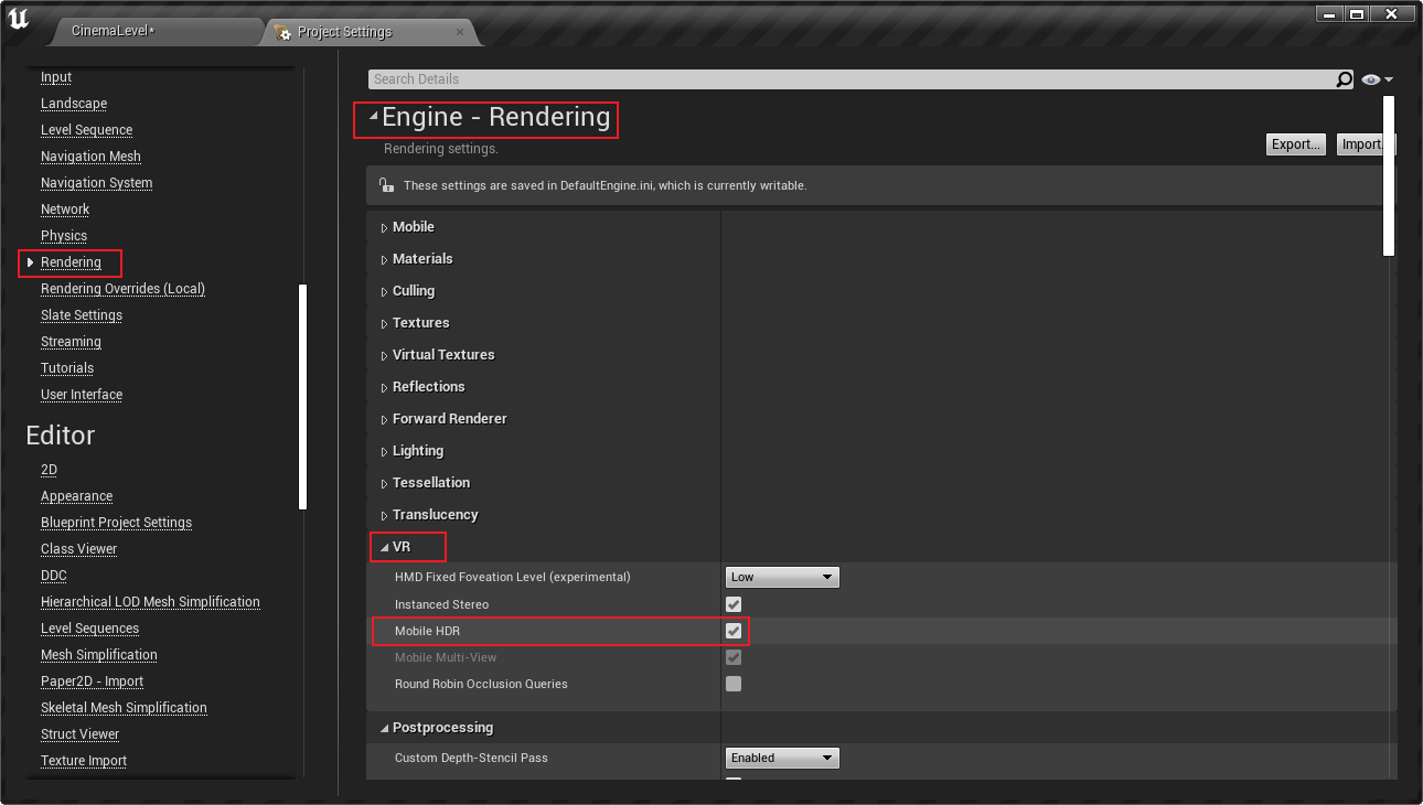 포워드 렌더링은 감마 공간과 HDR(선형 공간)의 두 가지 색 공간 모드를 지원합니다. 선형 공간인 경우 포스트 렌더링 단계에서 톤 매핑과 같은 단계가 필요합니다. 기본값은 HDR이며 프로젝트 구성에서 변경할 수 있습니다: