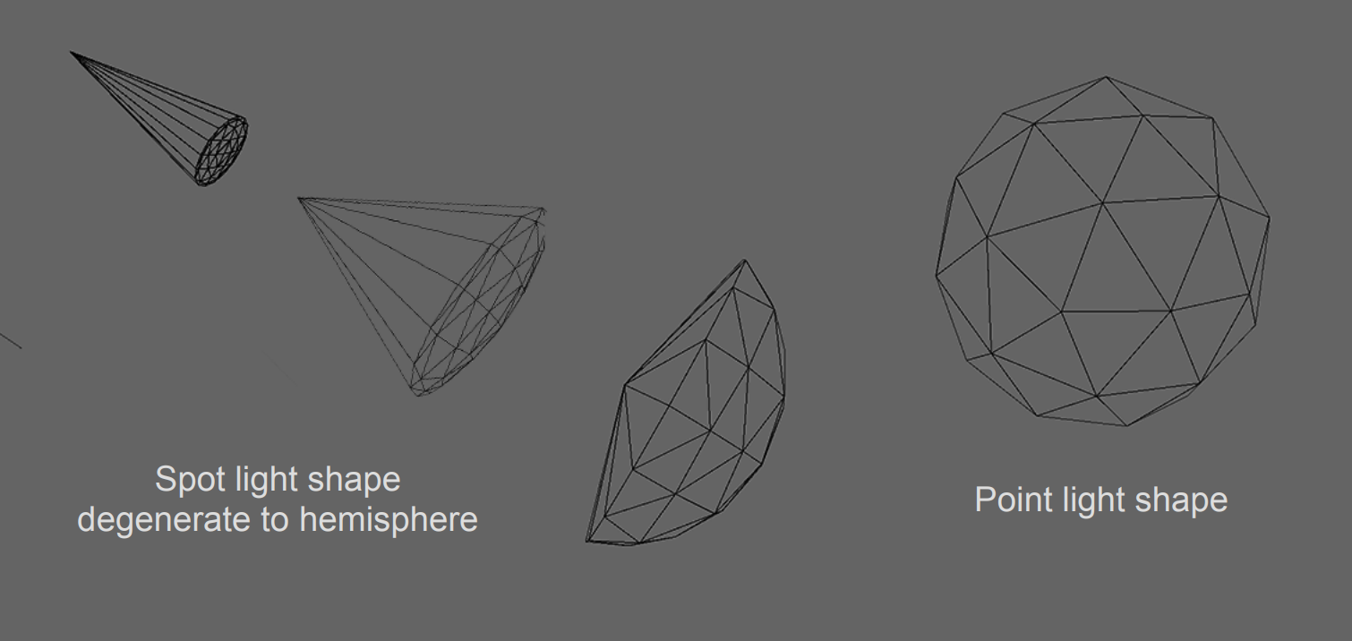 광원 드로잉을 수행하는 픽셀은 광원 모양 본체 내에 있어야 하며, 광원 모양을 벗어난 픽셀은 제거됩니다. 템플릿 패스는 광원 형상의 깊이보다 가까운 픽셀(광원 형상 본체 외부의 픽셀)을 표시하고, 광원 드로잉 패스는 템플릿 테스트를 통해 템플릿 패스로 표시된 픽셀을 제거한 후 깊이 테스트를 통해 광원 형상 본체 내부에 있는 픽셀을 찾아 광원 계산의 효율을 높입니다. 모바일용 라이트 스텐실 컬링 기법과 시그그래프2020의 Unity 강연 유니티 URP의 디퍼드 셰이딩에서 유사한 템플릿 기반 조명 계산을 언급합니다(아이디어는 동일하지만 접근 방식이 완전히 같지는 않을 수 있음). 이 논문에서는 광원의 모양에 더 잘 맞는 지오메트리 시뮬레이션도 제안합니다: