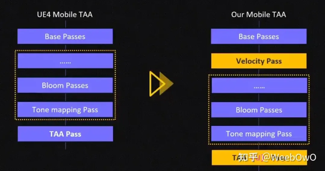 여기에 벨로시티 패스가 추가되고 TAA에서 TAAU로 변경된, 즉 업샘플 프로세스가 추가되었습니다. 여기서 제가 관심을 갖는 부분은 블룸과 톤 매핑 다음에 배치되는 TAA 패스의 배치 순서인데, 에지 노이즈가 증폭될 수 있다는 점입니다.