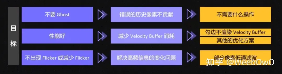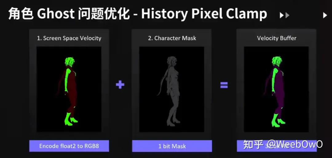 해결책은 캐릭터에 대해 별도의 VelocityBuffer를 열고 해당 TAA 계산을 수행하는 것이지만, 체크된 패스는 Velocity 캐릭터 마스크에 대응하는 반응이 없기 때문에 VelocityBuffer의 캐릭터에 검은 선이 생기는 또 다른 문제가 있지만 성능상의 이유로 결국 VelocityBuffer 렌더링은 수행하지 않았습니다.