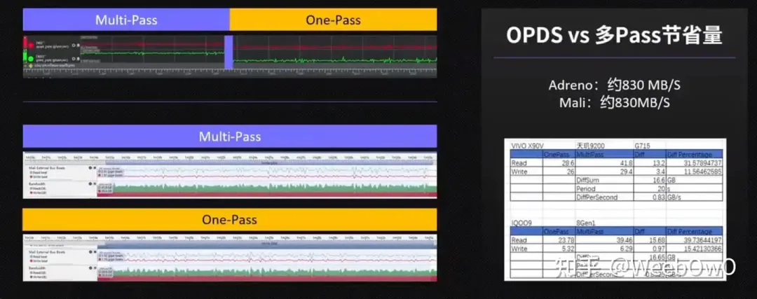 마지막으로 원 패스 디퍼드와 멀티 패스의 성능 비교를 보면 읽기의 경우 대역폭이 매우 크게 감소하고 쓰기의 경우 대역폭이 약간 감소하는데, 이는 모바일 디바이스가 RT를 매우 잘 압축하기 때문에 쓰기의 경우 눈에 띄는 이점이 크지 않은 것으로 분석됩니다.