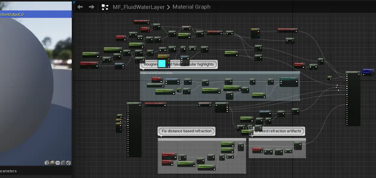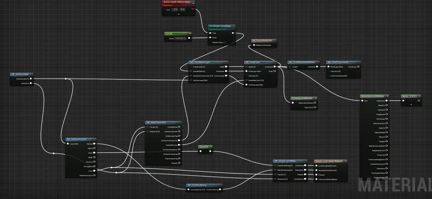 - 표면 레이어는 머티리얼이 SLW 특성을 갖도록 MF_FluidScattering, MF_FluidWaterLayer, MF_WaterTransition을 결합하여 유체 레이어를 얻습니다;