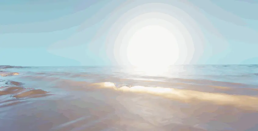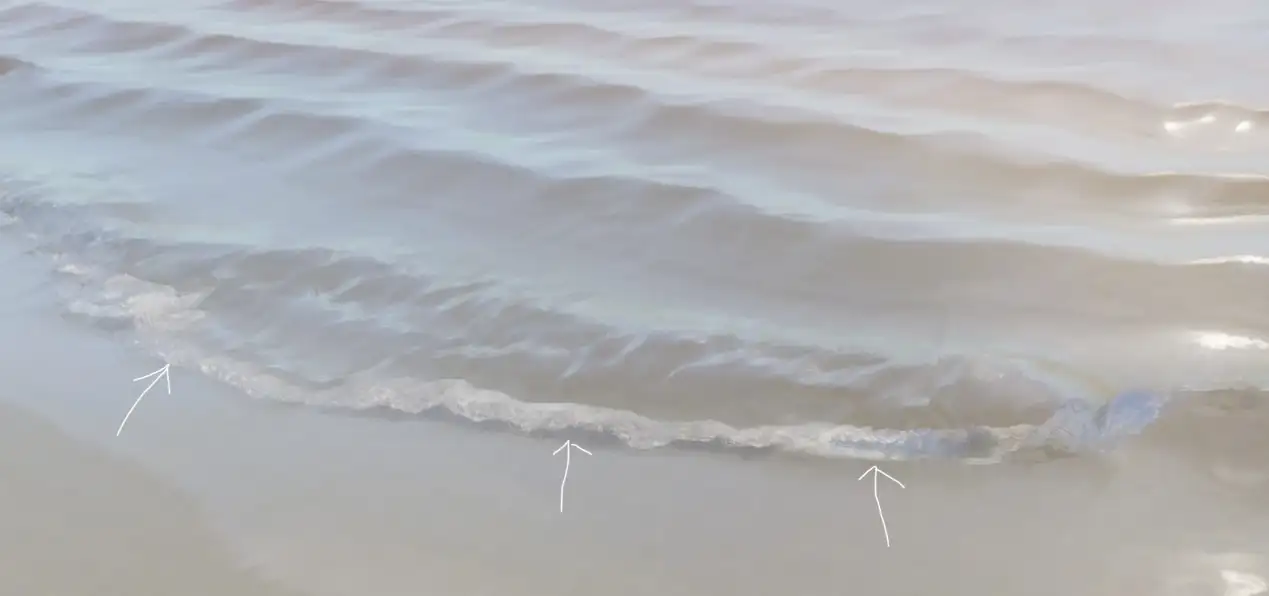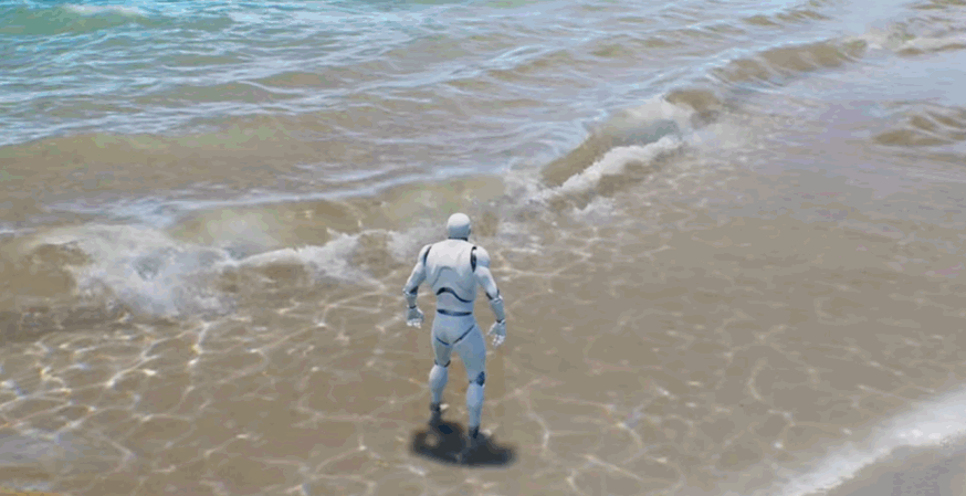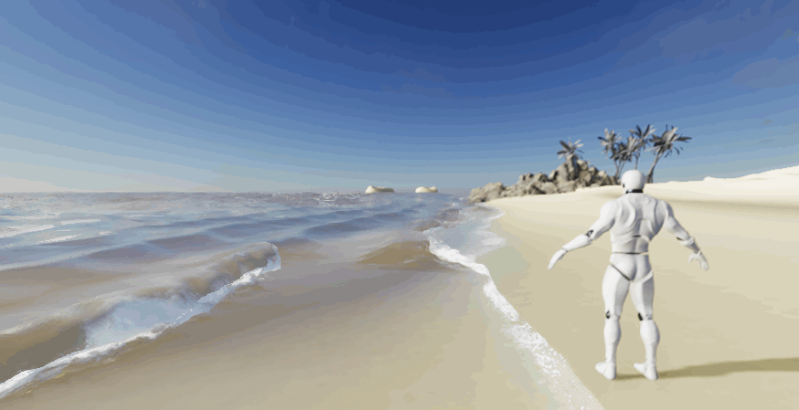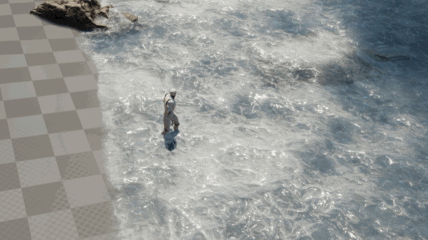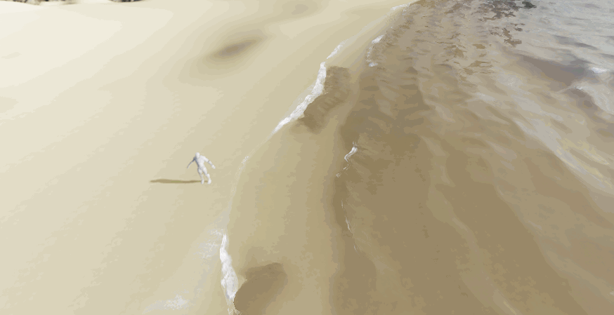 거품의 흐름 방향은 구운 기울기에서 파생되며, 기본 방향은 해안에서 멀어지고 파도가 밀려오면 속도 값이 역전되어 거품이 육지 쪽으로 흐르고 속도 차이를 사용하여 "거품이 해안을 때리고 후퇴하는" 효과를 얻습니다.