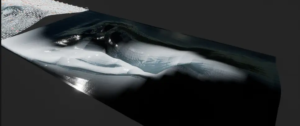 상상블렌드는 여러 웨이브 프로파일을 그려 웨이브 메시로 합성한 다음 VDM을 베이크할 수 있는 BP_FluxWaveProfileGenerator 툴을 제공합니다. Z축 변위만 있는 FF1에 비해 FF2 웨이브 VDM은 웨이브 팁이 구부러지고 끊어지는 효과가 있습니다.