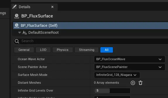 다양한 바다 메시 밀도를 표현하기 위해 FF2는 카메라 거리를 기준으로 씬에 64개의 동일한 3w 면을 배치하는 "NS_InfiniteSurfaceMesh"라는 나이아가라 시스템을 사용하여 "SM_FluxPlane128x128 "를 사용하여 메시의 LOD를 생성합니다.