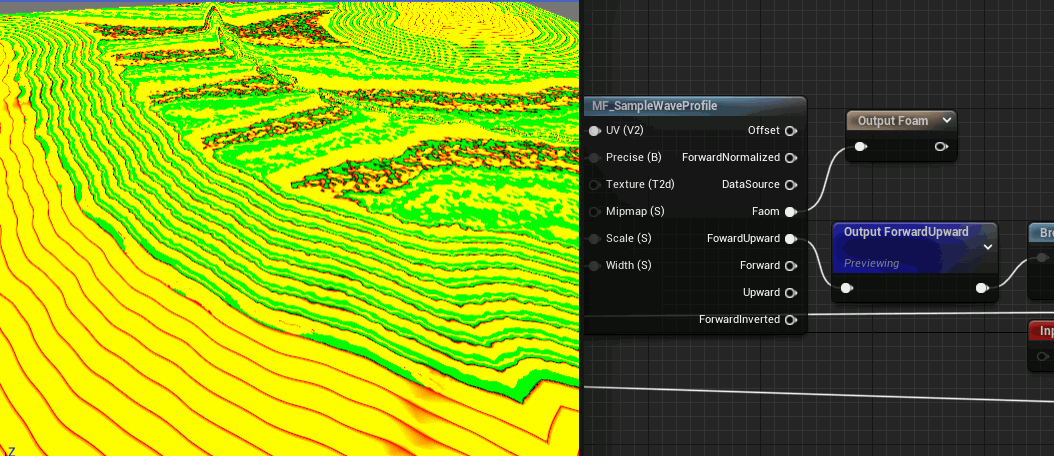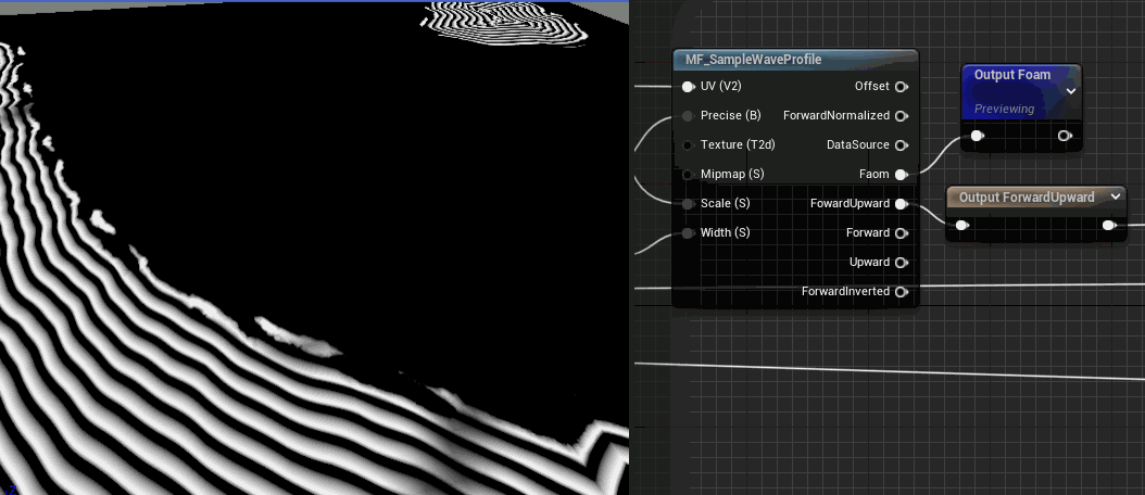 다시 주제로 돌아와서, 해안을 따라 측면 재생에서 VDM의 UV 마스크를 약간의 노이즈와 함께 가져온 후 MF_SampleWaveProfile에서 폼 마스크와 포워드업워드를 얻습니다.