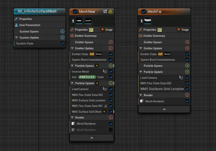 NS_InfiniteSurfaceMesh를 열면 이름에서 알 수 있듯이 두 개의 이미터가 있는데, 가까운 곳의 메시 니어와 먼 곳의 메시 파가 있습니다.