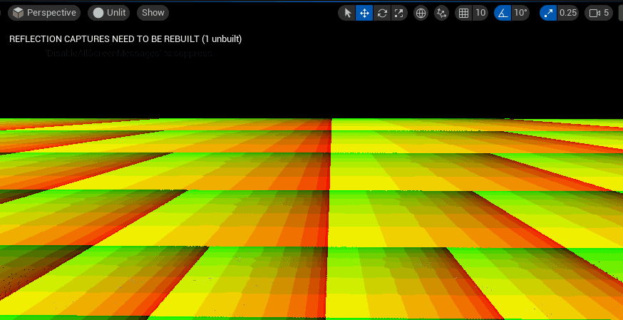 FF 프로젝트에는 M_DebugGrid라는 머티리얼이 있는데, 이 머티리얼의 BaseColor는 메시의 UV이며, 이를 메시의 머티리얼로 사용하면 메시 LOD가 쿼드 트리와 같은 분포를 갖는 것을 볼 수 있습니다. 카메라가 떨어지면 가장 가까운 SM_FluxPlane128x128이 1에서 4로 전환됩니다.