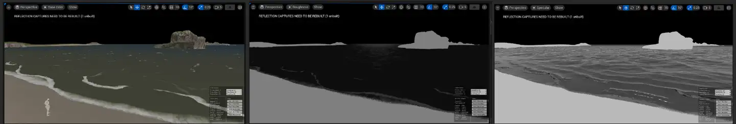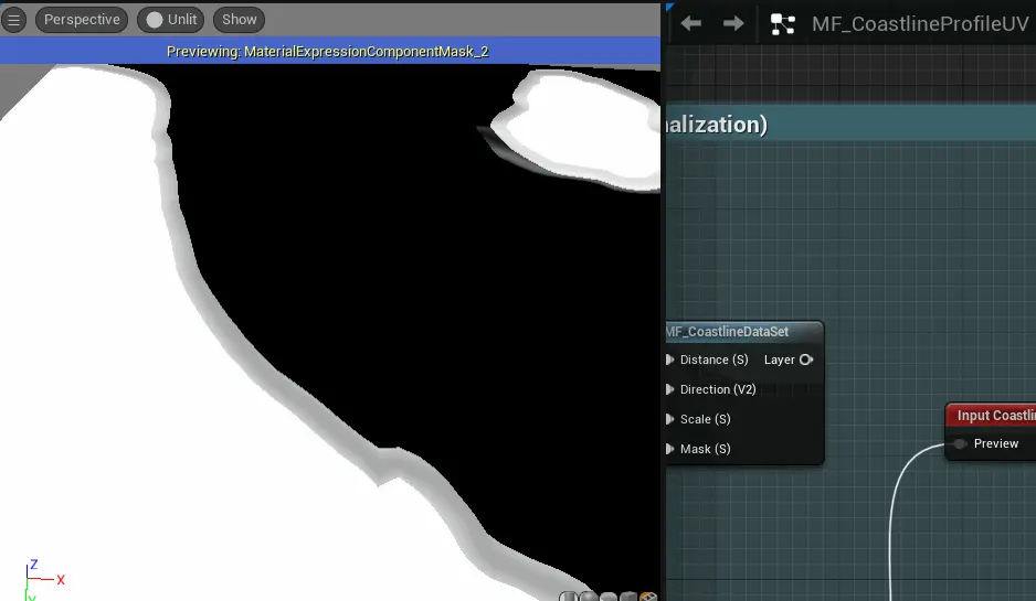 (이론적으로는 CoastlineMap_Coastline_Coastline, CoastlineMap_Coastline_Ground, T_DefaultWaveProfile_Forard, 디더 컷 아웃, 다른 구성표인 폼을 사용하여 원거리 파도만 사용하는 것으로 축소할 수 있습니다. 색상은 흰색이고 노멀이 잘려나가고 노이즈도 잘려나갑니다.)