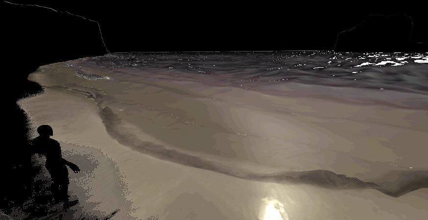 이 네 가지 맵을 사용하여 FF2에서 지형을 굽는 것은 해안의 마스크를 계산하고 약간 손질한 후 다양한 노이즈와 파도 텍스처로 작업하는 엔비디아 웨이브웍스 솔루션과 동일합니다. FF2의 근해 파도에 비해 웨이브웍스 효과는 훨씬 더 스크러시한 느낌을 줍니다.