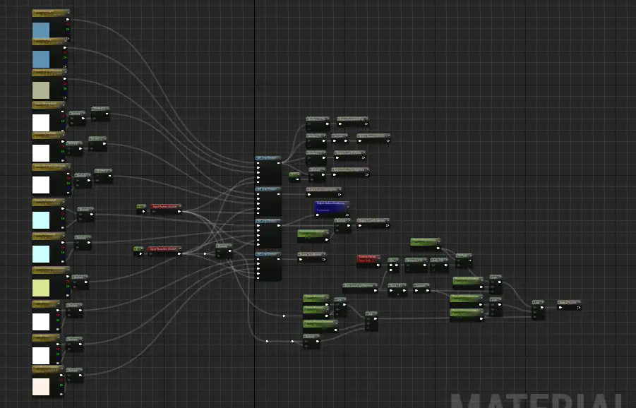 이것으로 버텍스 애니메이션과 노멀의 분해가 끝났으며, 모두 MF_SurfaceFlux_Coastline에서 계산됩니다. MF_SurfaceFlux_Coastline은 전체 M_FluxSurfaceOver에서 가장 복잡한 머티리얼 함수라고 할 수 있으며, 셰이딩 섹션에서 설명할 WPO와 노멀 외에 폼, 마스크, 속도, 다이버전스 및 기타 어트리뷰트를 계산합니다.。