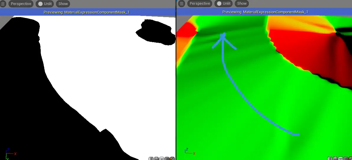 위 그림에서 계산된 결과를 샘플링된 VDM의 UV X축으로, 베이크된 sdf를 Y축으로 사용하여 해안을 따라 수평으로 재생되는 VDM의 UV 마스크를 얻습니다.