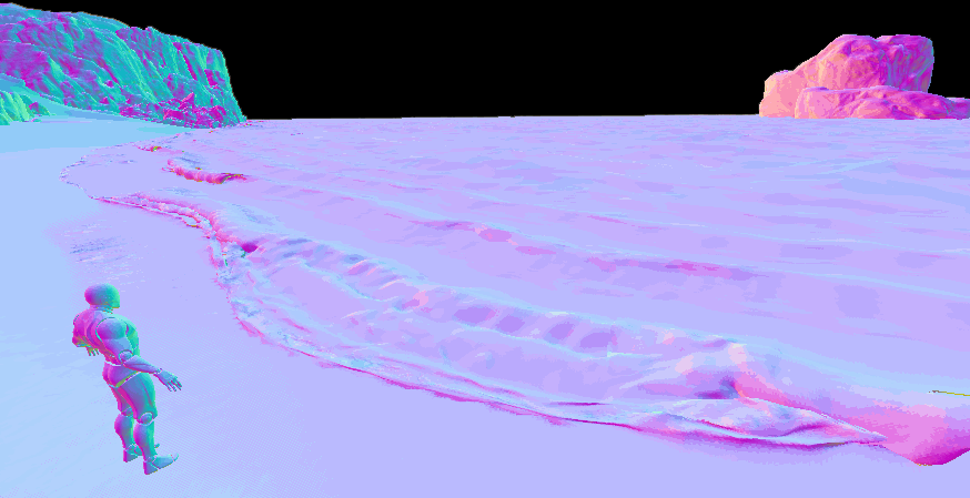 FF 2에서는 RT를 사용하지 않았고, 원거리 파도 버텍스 애니메이션에는 구운 FFT 플립북을, 근거리 파도 버텍스 애니메이션에는 벡터 디스플레이스먼트 텍스처(아래 VDM)를 사용했습니다.