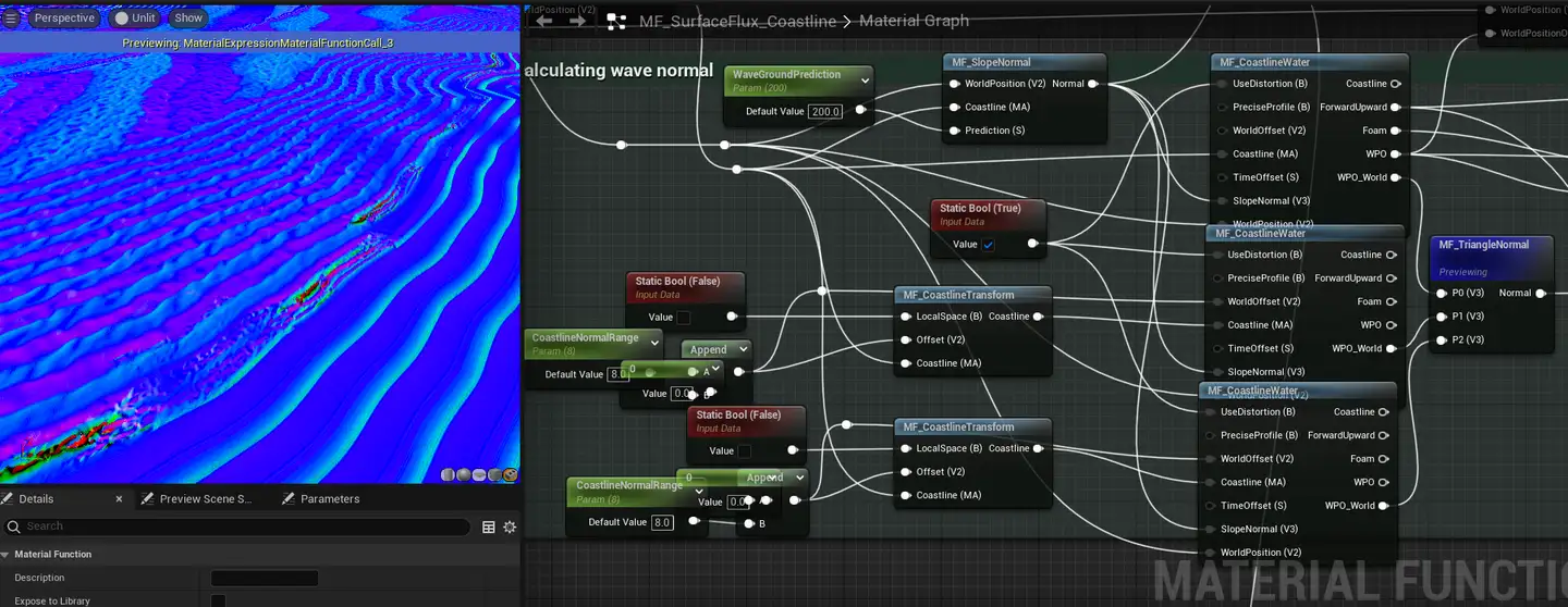 위에서 언급했듯이 MF_SurfaceFlux_Coastline은 가장 복잡한 머티리얼 노드 중 하나입니다. 노멀과 오프셋을 계산하는 것 외에도 다음 파라미터도 계산합니다.