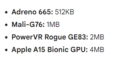 역자 주: 다만 모바일 디바이스의 Compute Buffer 는 512K 남짓이었다... 최신폰은 아직 조사하지 않았는데... 최에신 폰은 4메가 까지 지원 한다고는 한다. 2019년도에 실제로 대다수의 데이터를 GPU 사이드로 밀어넣고 처리 했는데... 버퍼 오버플로 나서 무식하게 GPU 로 때려박아도 안된다는 점이 함정이다...