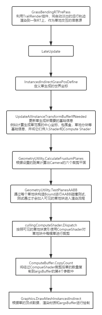핵심은 GrassBendingRTPrePass로, 트레일 렌더 컴포넌트를 사용하여 잔디 상호작용을 위한 정보 소스로서 자동 페이드 런 궤적을 단일 RT에 렌더링하는 것입니다.