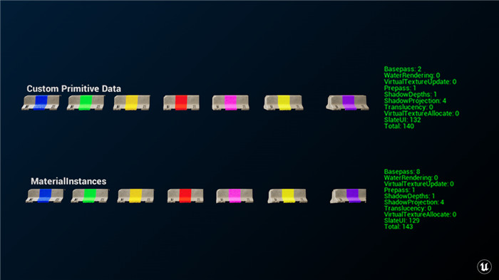 동일한 머티리얼을 사용하지만 지오메트리의 값을 수정할 수 있습니다.인스턴스별로 하지 않고 머티리얼에서 값을 조회할 수 있다면 모든 동일한 머티리얼을 일괄 처리하고 한 번만 그리기 호출을 할 수 있습니다.이렇게 하면 많은 수의 에셋을 살펴볼 필요가 없습니다.
