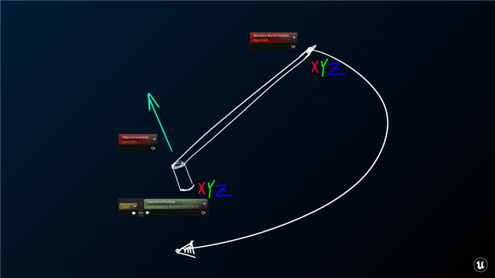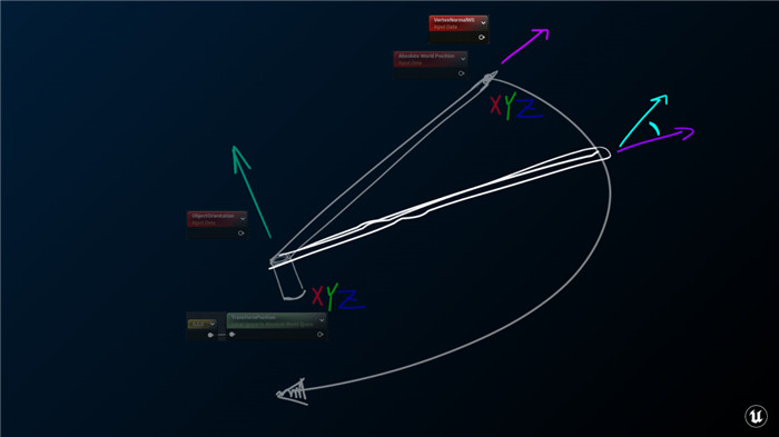 그런 다음 회전 축을 구성할 수 있습니다.시작점과 끝점 사이의 백분율 거리인 스칼라 값을 사용하겠습니다.선(라인)에서 가장 가까운 지점을 찾을 수 있는데, 이것이 라인 퍼센트입니다. 인스턴스별 사용자 지정 데이터를 사용하여 이 두 부동 소수점 값을 각 인스턴스에 전달하겠습니다.다이얼과 마찬가지로 여기에 색상으로 표시한 월드 포지션 오프셋을 사용하여 이 링크에 애니메이션을 적용해야 합니다.예를 들어 이 보라색 점을 찾으려면 녹색 선을 따라 인스턴스당 지점을 알아야 하고 이 파란색 선이 흔들리고 있습니다.