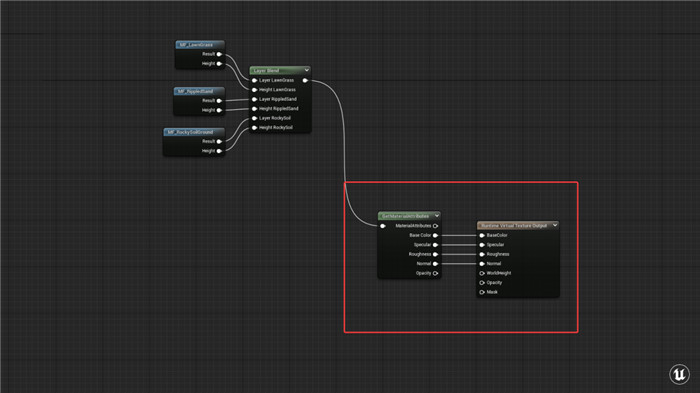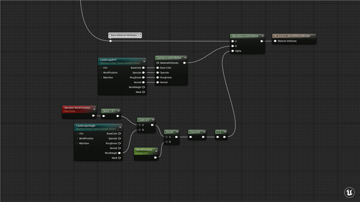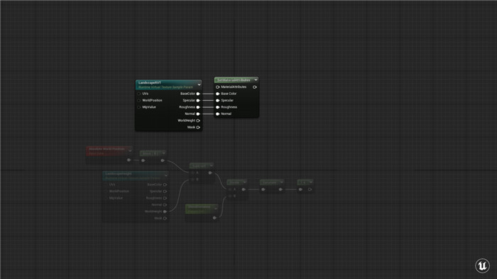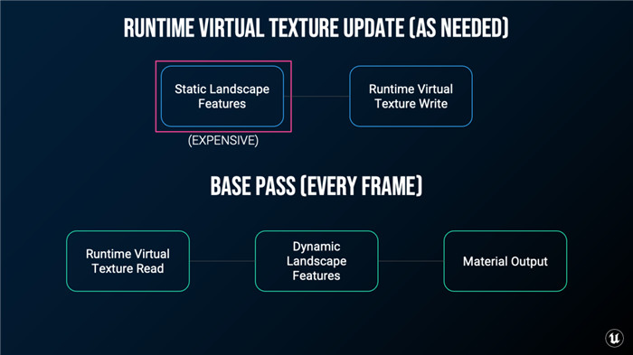 이러한 머티리얼에 대한 대부분의 계산을 자주 업데이트되지 않는 런타임 가상 텍스처로 옮기고 거기에서 샘플링하여 지형 자체에 그릴 수 있습니다.이렇게 하면 더 많은 오버헤드가 필요한 지형 머티리얼의 비동적 부분을 매 프레임마다 고려할 필요가 없으며, 궁극적으로 화면에 픽셀을 그릴 때 픽셀의 월드 위치에서 RVT를 샘플링하기만 하면 됩니다.