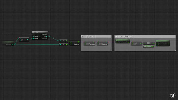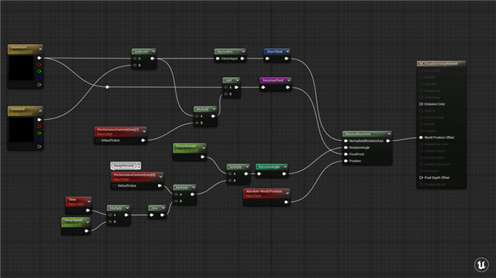 회전 각도의 경우, 스웨이 퍼센트에 타임 사인을 곱한 다음 회전 범위를 제한할 총 스웨이 양에 인스턴스별 커스텀 데이터 0으로 전달할 총 스웨이 양을 곱합니다.여기에 총 스웨이 양을 곱하여 회전을 제한한 다음, 이 모든 것을 Rotate About Axis 노드로 임포트하고 월드 포지션 오프셋을 수행합니다.