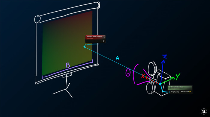스크린과 프로젝터가 있고 프로젝터를 사용하여 0에서 1까지의 UV 좌표를 스크린에 투사하고 있는데, 스크린 소재에서 해당 UV 좌표를 찾으려면 어떻게 해야 할까요?프로젝터의 위치와 프로젝터가 가리키는 방향을 알아야 벡터를 '프로젝터에서 픽셀'에서 '프로젝터 공간'으로 변환할 수 있습니다.
