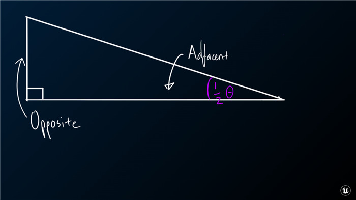 때로는 치수를 제거하면 문제가 더 쉬워지기도 합니다.이제 픽셀 프로젝터 벡터인 A와 프로젝터의 시야각인 θ가 있고 B를 구해야 합니다. 프로젝터의 선을 화면의 측면으로 확장하면 전체 그림이 이등변 삼각형처럼 보이며 이등변 삼각형은 두 개의 직각 삼각형으로 이루어진 것으로 생각할 수 있습니다.그러면 한 변의 변 길이와 각도만 알면 많은 것을 알 수 있습니다. 이제 FOV, 이 직각 삼각형의 면적이 이등변 삼각형의 면적의 절반이면 각도는 FOV의 각도의 절반이고, 프로젝터에서 스크린까지의 거리 인이 변의 변 길이를 알고 있으므로 삼각형의 다른 쪽 변의 길이를 계산할 수 있으면 이 변의 길이를 계산할 수 있습니다.네, 이쪽이 이 각도의 인접한 쪽입니다!