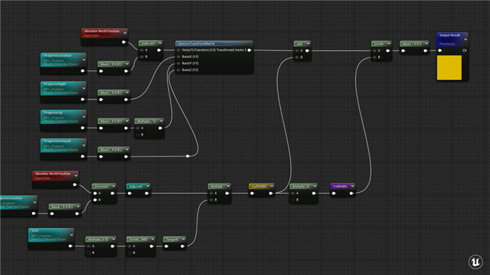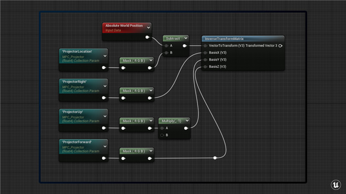 여기에는 벡터 월드 위치에서 프로젝터 위치로의 변환 벡터만 필요합니다.머티리얼 파라미터 컬렉션에서 샘플링하면 자동으로 Float4로 나타나므로 축에 마스킹합니다.