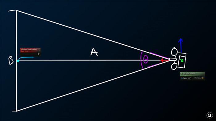 여기서는 탄젠트, 탄젠트 x 인접 에지 = 반대쪽 에지를 사용하겠습니다.카메라의 FOV가 있으므로 이를 반으로 줄인 다음 인접 에지를 픽셀에서 프로젝터까지의 거리로 사용할 수 있습니다.좀 더 명확하게 하기 위해 머티리얼의 정보를 추적하는 데 도움이 되는 새로운 네임드 리라우트 노드를 사용했습니다.