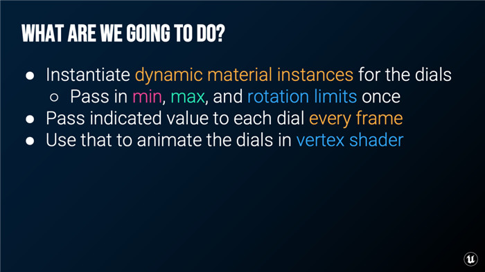 첫 번째는 동적 머티리얼 예시를 통해 자동차 대시보드에 애니메이션을 적용하는 방법을 보여줍니다.이를 통해 런타임에 머티리얼의 텍스처, 벡터 및 스칼라 파라미터를 변경할 수 있습니다.