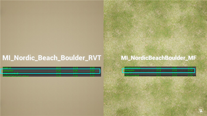 그러나 이 효과는 더트 스커트 기법으로 항상 가능한 것은 아닙니다.이 기법과 다른 대안의 성능 차이를 테스트하기 위해 전체 화면 쿼드를 만들고 두 가지 머티리얼, 그중 하나는 기본 RVT 블렌드이고 다른 하나는 모든 머티리얼 레이어를 블렌딩할 수 있는 머티리얼을 앞뒤로 전환해 보았습니다.