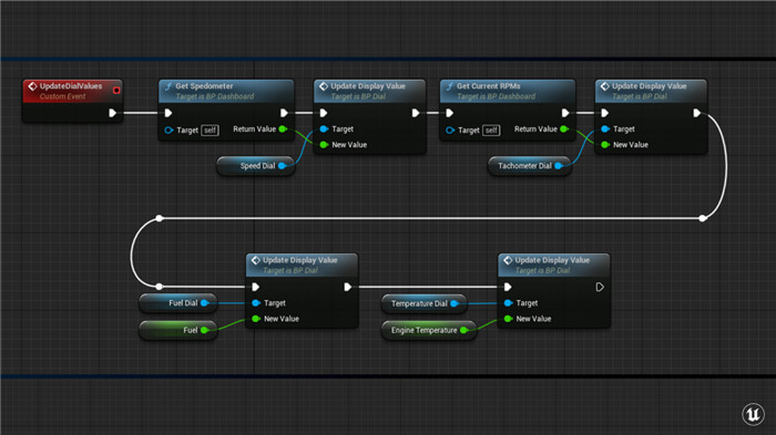 다이얼의 블루프린트에는 타코미터의 RPM, 속도계의 속도 등 각 다이얼에 적합한 값을 입력합니다.각 프레임에는 최신 값이 표시되며, 이것이 바로 청사진 측면에서 다루는 내용입니다.각 다이얼은 이 모든 로직이 실행되는 자체적인 청사진입니다.