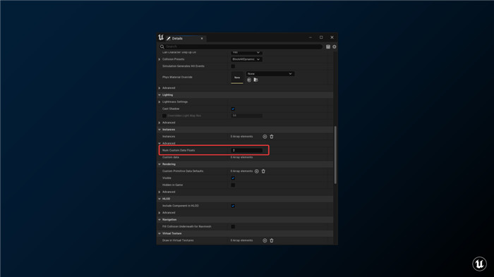 숫자 커스텀 데이터 플로트를 사용하여 인스턴스화된 스태틱 메시 컴포넌트에 인스턴스별 데이터를 전달할 것임을 엔진에 알려야 합니다."스웨이 양"과 "라인 퍼센트"입니다.인스턴스화된 스태틱 메시에서 커스텀 프리미티브 데이터를 설정할 수도 있지만, 컴포넌트의 모든 인스턴스에 적용됩니다.