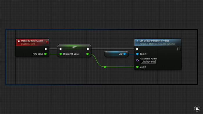 효율성을 위해 최대, 최소 및 회전 제한을 머티리얼 내에서 분할할 수 있는 벡터에 담았습니다.머티리얼 인스턴스에서 "벡터 파라미터 설정"을 호출하고 이름을 머티리얼에 설정할 이름으로 설정한 다음 블루프린트에 "표시 값"을 머티리얼 인스턴스에 전달하는 함수가 있습니다.이제 다이얼은 동일한 파라미터 이름인 표시 값을 사용하게 되는데, 표시되는 세부 사항은 플레이어가 관심을 가질 필요가 없기 때문입니다.