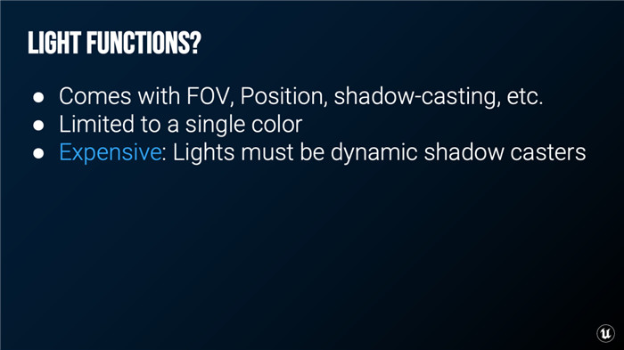 라이트 기능에 대해 말하자면, 언리얼 엔진에서는 스포트라이트에 머티리얼을 적용할 수 있습니다.그렇다면 왜 사용하지 않을까요?조명 기능에는 몇 가지 제한이 있을 수 있으며, 예를 들어 조명 기능은 그레이 스케일이며 투사된 빛의 강도만 변경하고 색상은 변경하지 않는 등 상황에 정확히 맞지 않는 경우가 있습니다.따라서 풀 컬러 프로젝션의 경우 컬러 시스템에 동일한 재질을 제공해야 하는데, 이는 매우 복잡합니다.광원에 대한 조명 기능을 설정하면 이 광원이 동적 그림자 투사기로 간주되어 성능 예산에서 매우 많은 오버헤드가 발생할 수 있기 때문입니다.