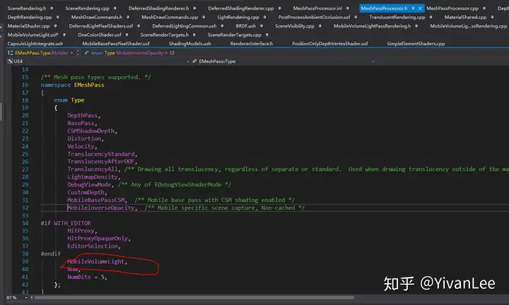 먼저 MeshPassProcessor.h를 찾아 파이프라인의 모든 메시패스 유형을 찾습니다.버전 4.26.0에는 기본적으로 23개의 메시패스가 있으며, 이 중 3개는 에디터용 패스입니다.
