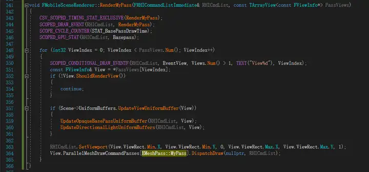 (코드를 직접 작성할 필요 없이 위의 FMobileSceneRenderer::RenderMobileBasePass 에서 직접 복사하여 약간만 수정하면 됩니다).