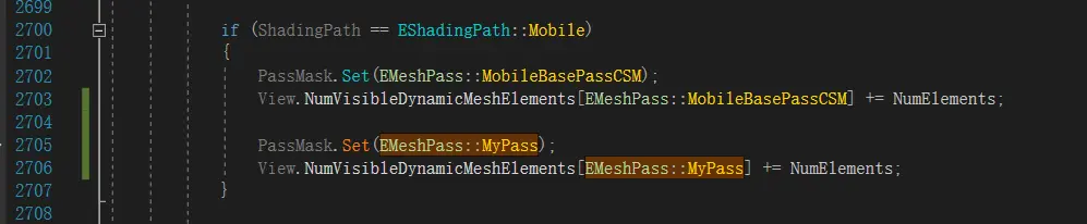 SceneVisibility.cpp에서 스태틱 메시와 다이내믹 메시를 위한 MyPass 코드를 추가합니다: