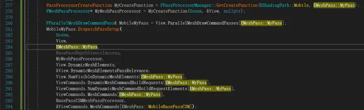 그런 다음 MobileShadingRenderer.cpp 에 MyPass 관련 코드가 추가되는 곳에서 SetupMobileBasePassAfterShadowInit 의 정의를 찾을 수 있습니다: