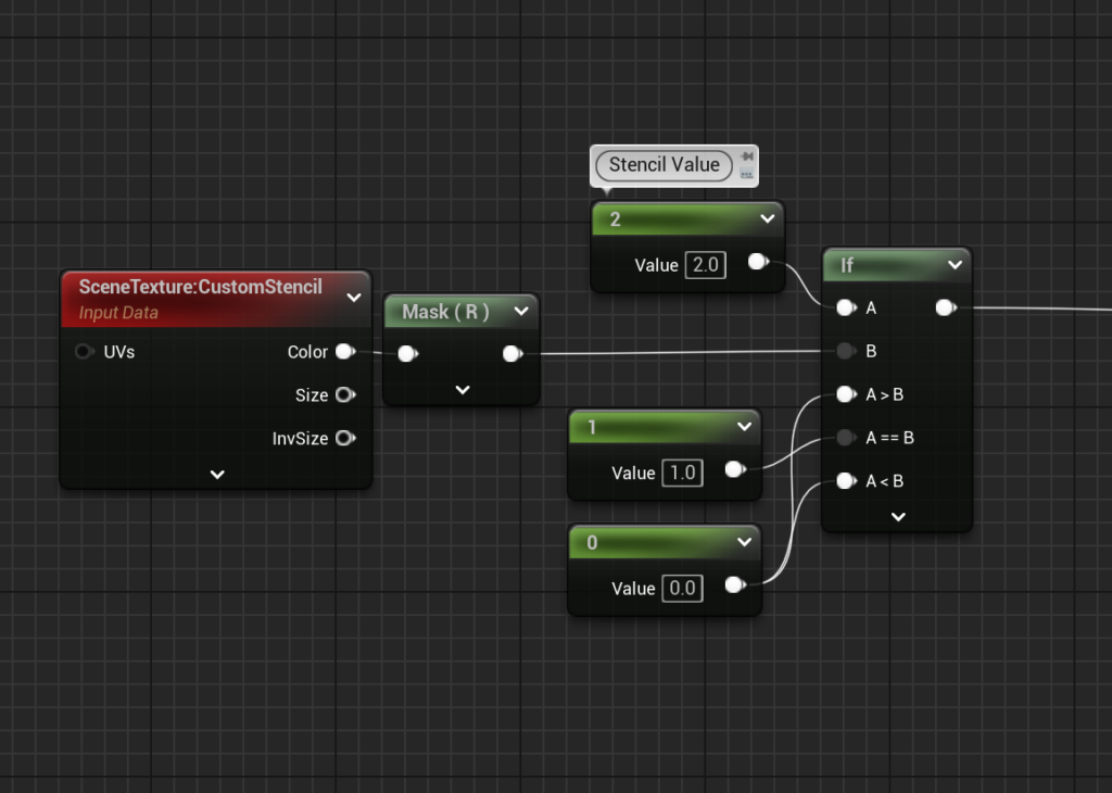 제목처럼 서로 다른 Stencil 값의 교차점을 구해오는데, 캐릭터 내에서 사용할 경우 안정적이지 않을 수 있습니다.(월드 전체에서 캐릭터를 봤을 때, 깊이 차이가 너무 작기 때문?)