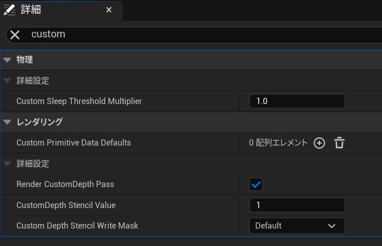 - 'CustomDepth Stencil Value'를 '기타'에 걸리지 않도록 적당한 값으로 설정한다.예시에서는 2( 이 수치를 설정할 때 주의해야 할 점이 있습니다.이에 대해서는 나중에 소개하겠습니다.)