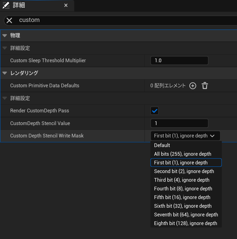 - "Custom Depth Stencil Write Mask'를 'First bit(1)'~'Eighth bit(128)' 중 하나로 설정한다.예시에서는 'First bit'