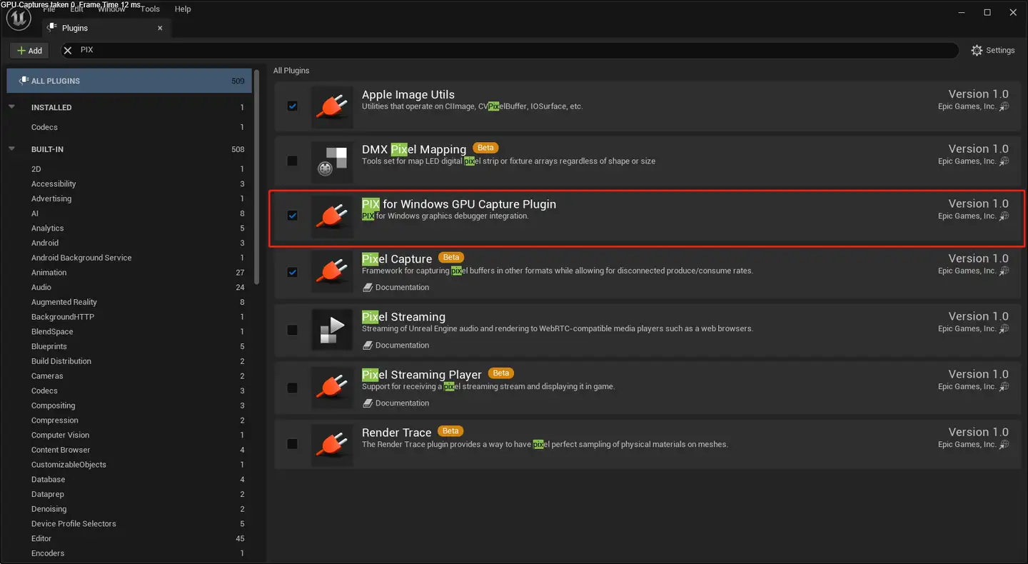 두 플러그인 모두 엔진 충돌의 원인이 되는 dxgi.DLL을 로드하려고 시도하므로 RenderDoc 플러그인을 먼저 꺼야 하며, 기본적으로 켜져 있는 PIX 플러그인이 켜져 있는지 확인해야 합니다:
