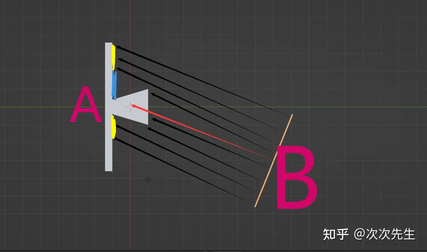 오브젝트 A를 광 수집기, 오브젝트 B를 광 발광체라고 가정하고, 광 발광체는 AB(빨간색 화살표)의 거리 방향을 따라 빛(검은색 화살표)을 방출하고 노란색 영역은 광 표면, 파란색은 그림자 표면이라고 가정하면 광 발광체 B가 거리 방향을 따라 오브젝트 A에 매핑된다고 생각할 수 있는데, 이 아이디어는 이전에 KATHU의 비슷한 아이디어를 한 사람이 RenderTarget과 매트릭스 변환을 통해 수행한 적이 있습니다.섀도 맵을 생성하기 위해 렌더타겟과 매트릭스 변환을 통해 이전에도 해본 적이 있지만 소비량 문제가 있어서 이 아이디어를 따르되, 렌더타겟과 맵을 사용하는 대신 섀도 모델을 복셀로 슬라이스한 다음 복셀에서 그림자 정보를 계산하여 렌더 파이프라인으로 보내도록 하겠습니다.