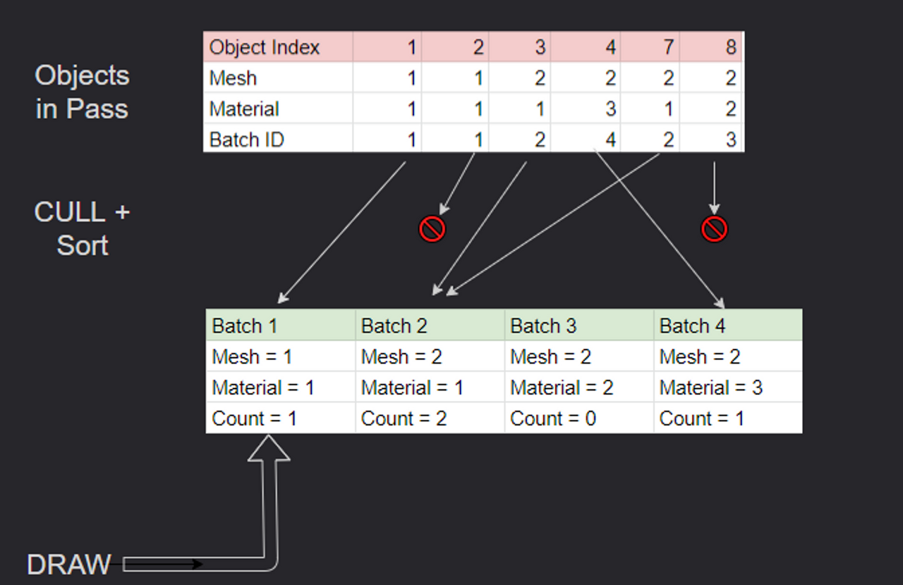 ObjectID + BatchID 쌍의 배열에 있는 모든 개체에 대해 ObjectID를 사용하여 ObjectBuffer 의 개체 데이터에 액세스하고 그것이 보이는지 확인한다. 표시되는 경우 BatchID index를 사용하여 그리기 간접 호출이 포함된 Batch array에 그리기를 삽입하여 인스턴스 수를 늘린다. 또한 각 batch 의 InstanceID 에서 ObjectID 로 매핑되는 간접 버퍼에 이것을 writing 합니다.
