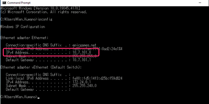 2. 빌드 머신 PC의 IP 주소 확인 PC에서 명령 프롬프트를 열고 ipconfig를 입력하여 빌드 머신의 IP 주소를 확인한다. 그림의 경우, "10.7.101.8"이 빌드 머신의 IP 주소이므로 나중에 사용할 수 있도록 메모해 둔다.