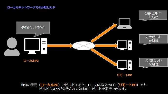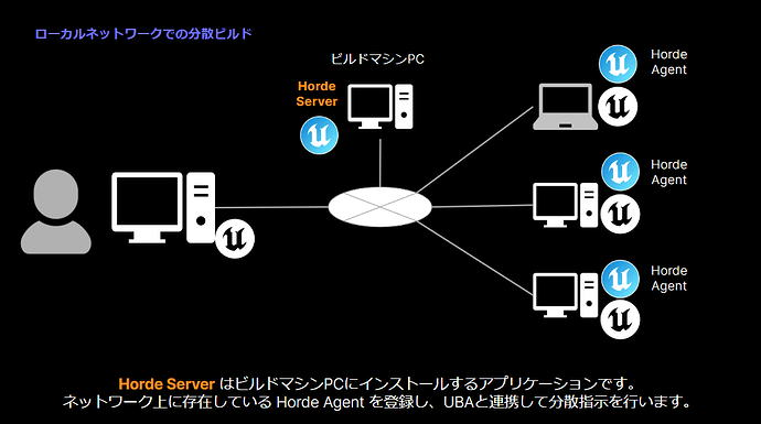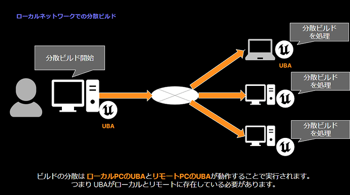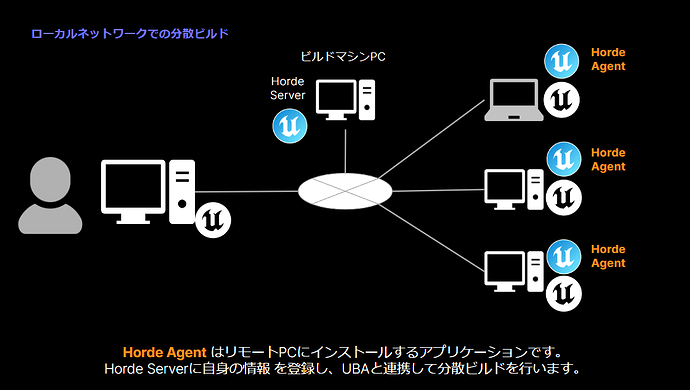 ※ UBAは UE5.4 でベータとして公開されている機能です 1. 概要 UE5.4 から導入された UnrealBuildAccelerator (以降、UBA) を使用して分散ビルドするためのセットアップ方法を記載します。以下は分散ビ