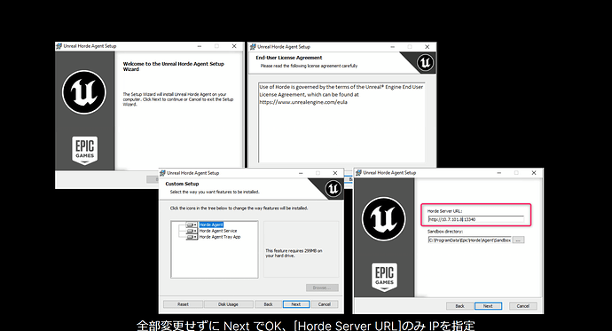 설치 프로그램 설정은 기본적으로 변경할 필요 없이 [Next]를 눌러 진행하면 되지만, 마지막 HordeServer IP를 지정하는 부분에서는 메모해 둔 HordeServer(빌드 머신 PC)의 IP, "http://[HostIp ]:13340"을 입력(예: http://10.7.101.8:13340 1 )합니다.