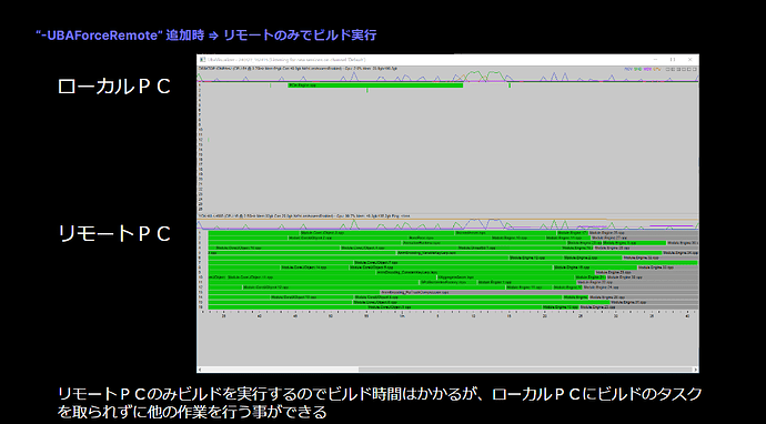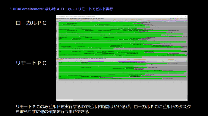 "-UBA"는 UBA를 사용하여 분산 빌드를 수행하도록 지정합니다. "-UBAVisualizer"는 분산 빌드 작업을 나타내는 애플리케이션 실행을 지정한다. "-UBAForceRemote"는 원격 PC에서만 빌드 실행 여부를 지정한다.